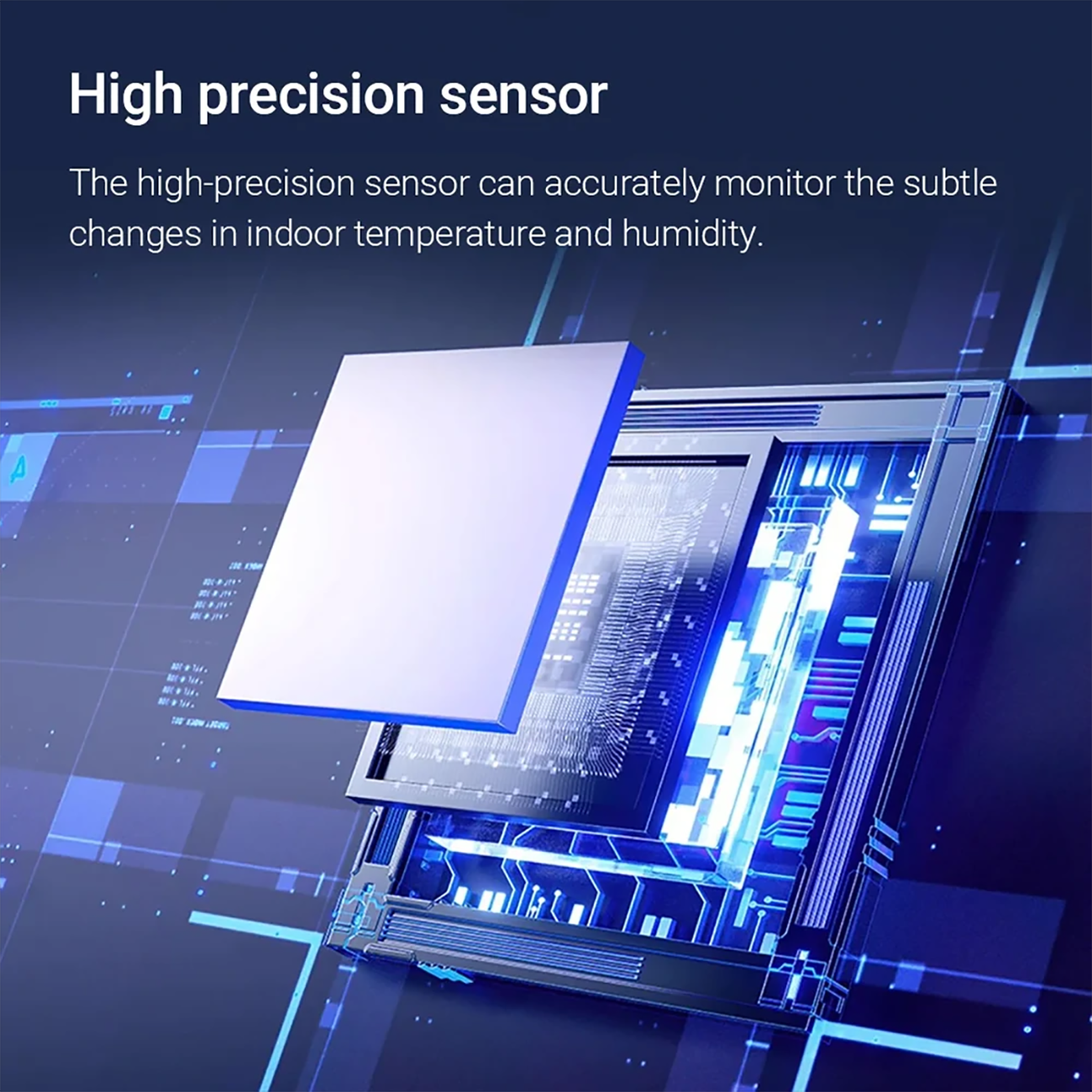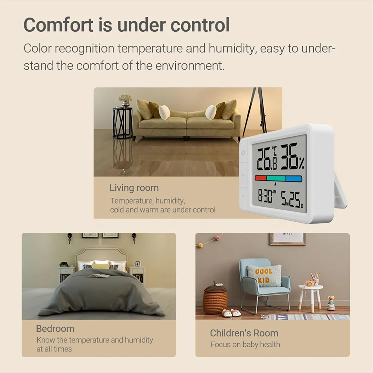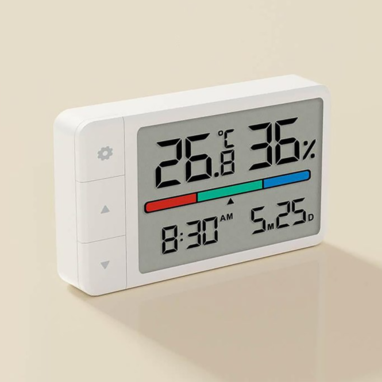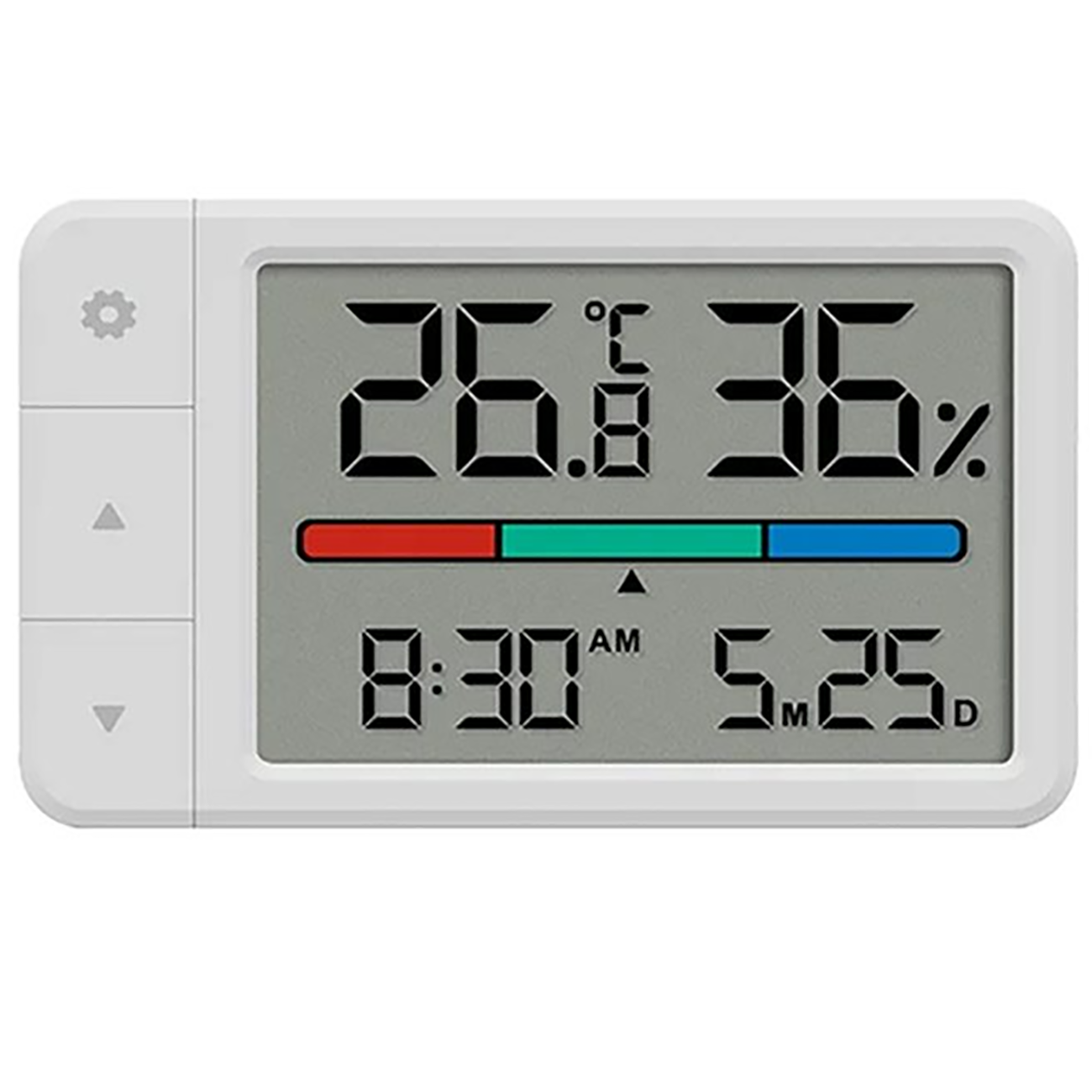 نمایش هوشمند و رنگی: LCD HD با نوار رنگی (قرمز برای هشدار، سبز برای ایدهآل، آبی برای خشک) – دما ۱۹-۲۷ درجه و رطوبت ۳۰-۷۰% رو نشون میده، به علاوه ساعت و تاریخ.