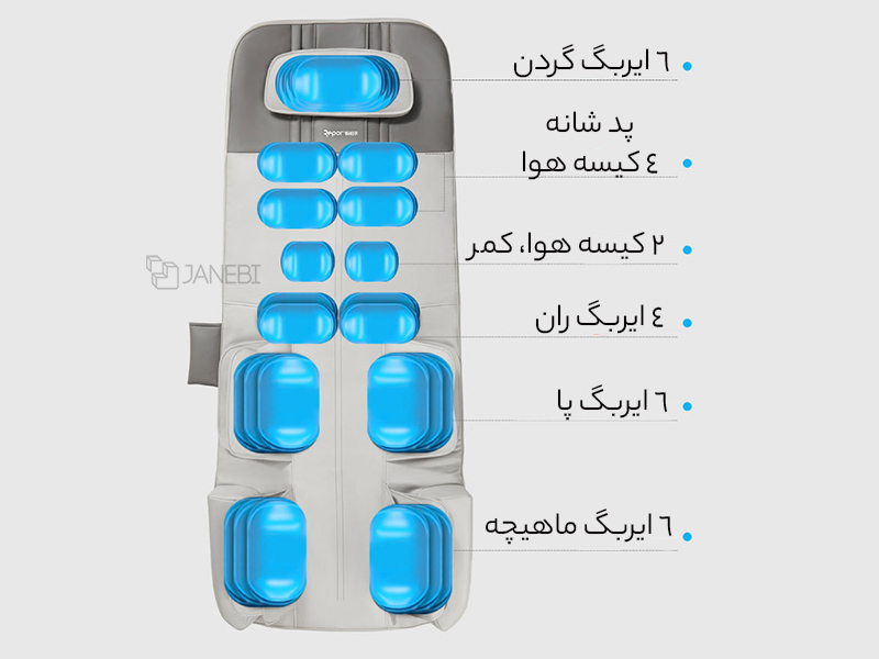| کاربری بالا | ماساژ عمیق تر و همه جانبه شانه ها، گردن، کمر، پشت، رانها و پاها |