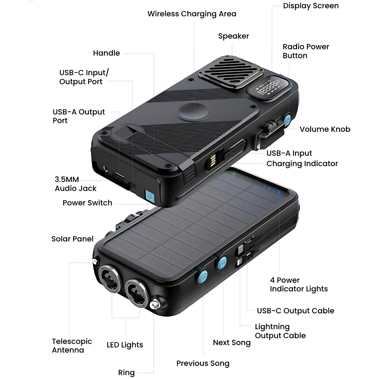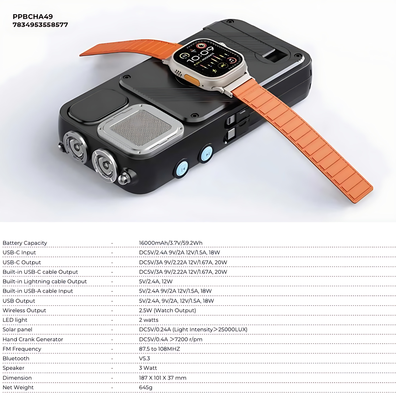 | قابلیتهای ویژه | کابل تایپ سی و لایتنینگ متصل به بدنه,پنل خورشیدی,دارای چراغ قوه,اسپیکر بلوتوث,ساعت دیجیتالی,رادیو FM,شارژر وایرلس اپل واچ,دسته دینام دستی |