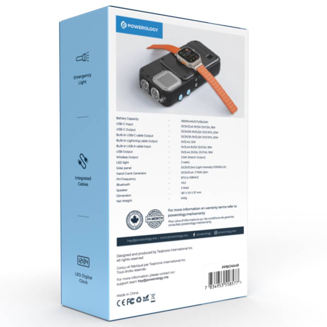 پاوربانک خورشیدی 16000 میلیآمپرساعت، اسپیکر بلوتوثی، رادیو، چراغ قوه، ساعت دیجیتالی و شارژر وایرلس اپل واچ پاورولوژی PPBCHA49
