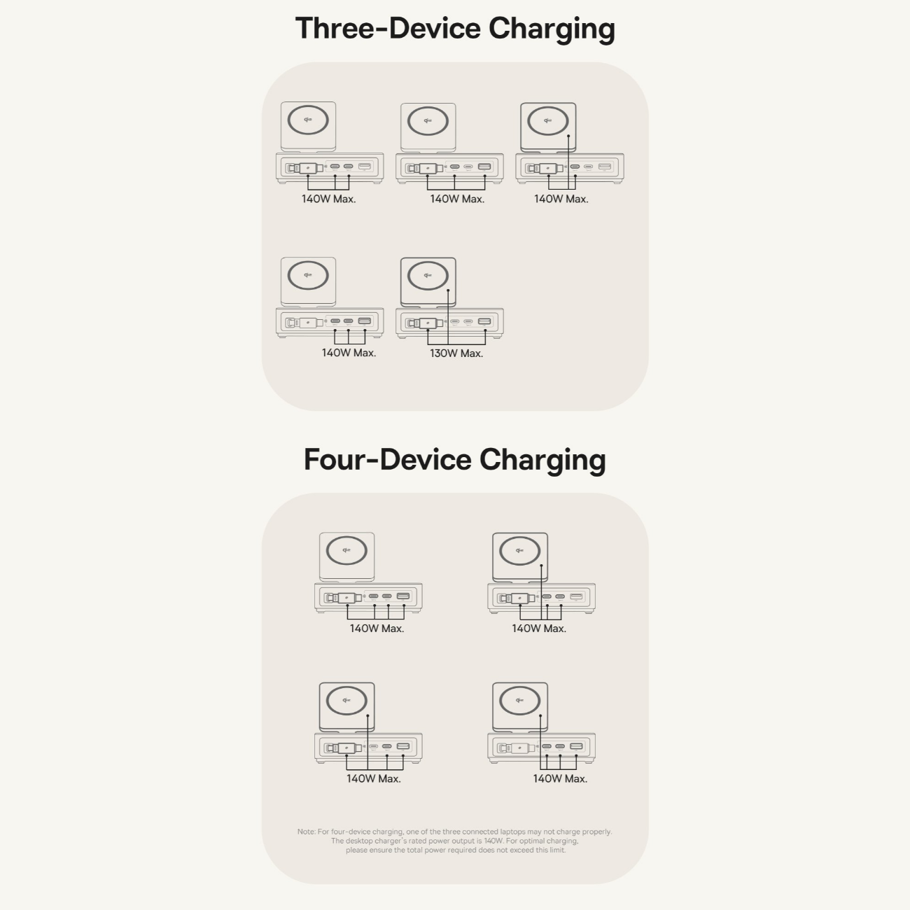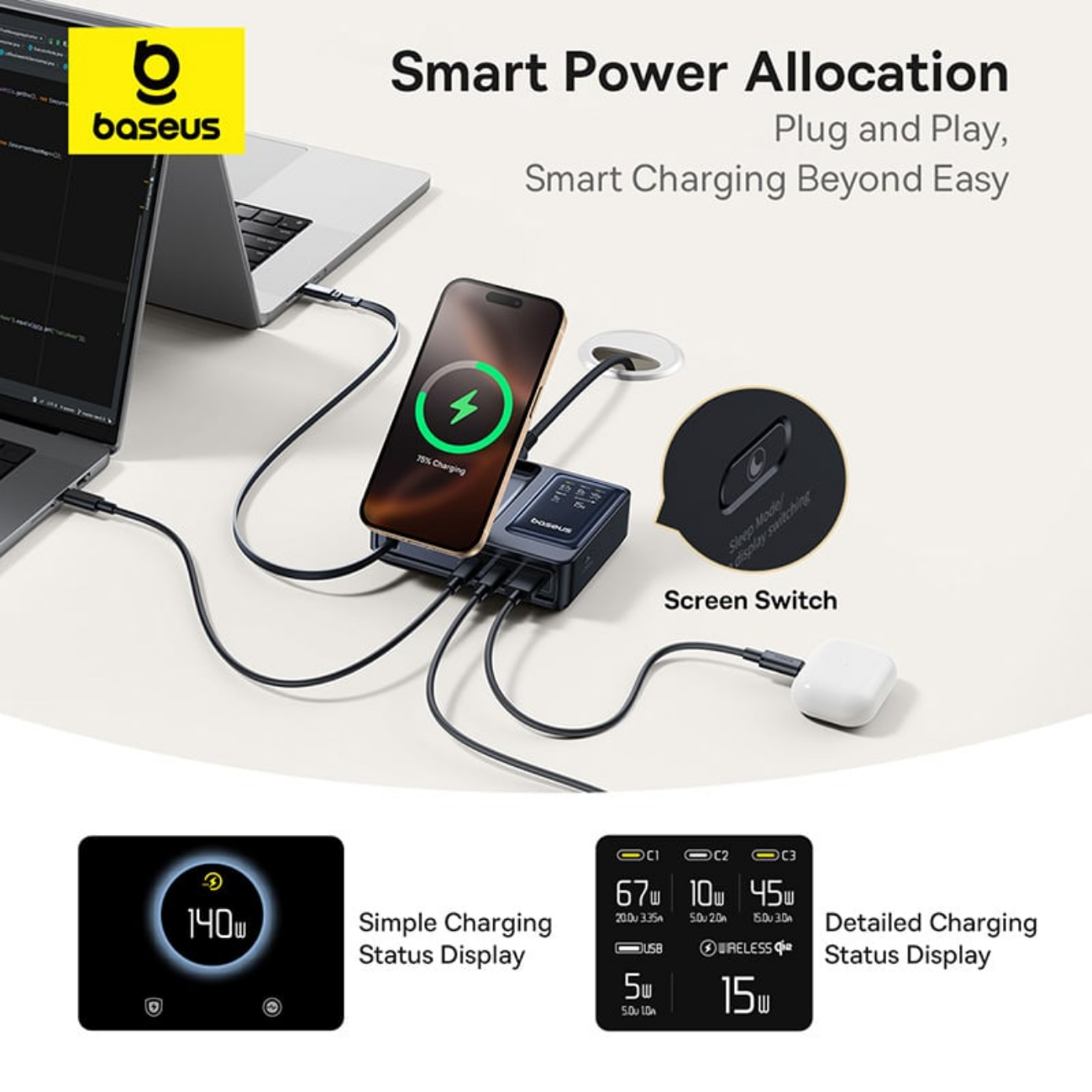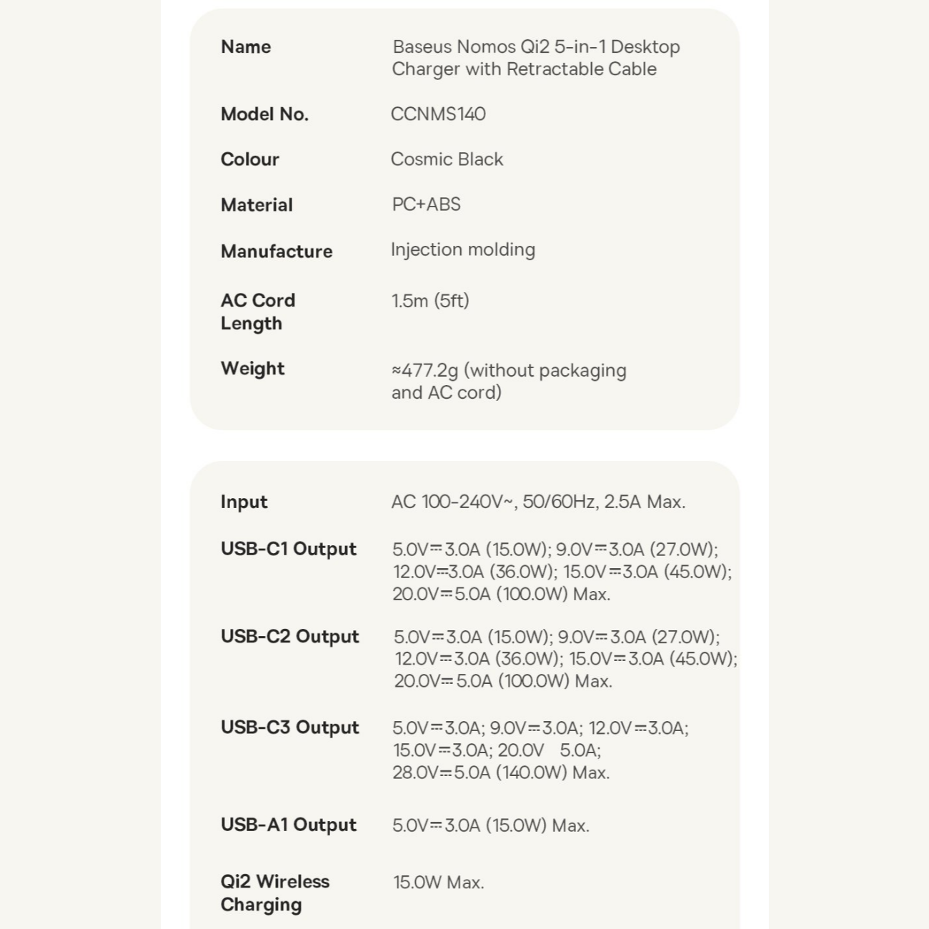 | سایر ویژگیها | توان کلی خروجی 140W با قابلیت تقسیم هوشمند بین پورتها پشتیبانی از فناوری PD 3.1, PD 3.0, QC 3.0, PPS و پروتکلهای شارژ سریع متداول شارژ وایرلس مغناطیسی استاندارد Qi2 با توان 15W برای آیفون (سری 12 تا 16، iOS 17.2+) توان وایرلس 5W برای برخی گوشیهای اندرویدی مجهز به Qi2 دارای 2 پورت USB-C با توان خروجی تکی هرکدام تا 100W مجهز به کابل USB-C جمعشونده (Retractable) با توان 100W 1 پورت USB-A با توان خروجی تا 15W نمایشگر دیجیتال LED/LCD برای نمایش توان لحظهای و وضعیت شارژ ورودی برق: AC 100-240V، 50/60Hz، 2.5A (max) کابل برق جداشونده با طول 1.5 متر جنس بدنه: پلاستیک مقاوم PC + ABS با تحمل حرارت و ضربه طراحی جمعوجور و رومیزی مناسب برای خانه، دفتر کار و سفر پایه شارژ وایرلس تاشو با قابلیت تنظیم زاویه و اتصال مغناطیسی قوی سازگار با لپتاپهای پرمصرف (MacBook Pro و سایر لپتاپهای USB-C) قابلیت شارژ همزمان چند دستگاه مختلف بدون افت سرعت محسوس تراشه هوشمند برای حفاظت در برابر اضافهولتاژ، اتصال کوتاه، افزایش دما و اضافهبار گواهی رسمی Qi2 (QI-ID 22121) برای شارژ بیسیم مطمئن تستهای ایمنی و گواهی FCC برای اطمینان از کیفیت و استاندارد جهانی طراحی مینیمال و زیبا برای مرتبسازی میز کار مناسب برای شارژ گوشی، تبلت، لپتاپ، هدفون و سایر گجتها محتوای جعبه: شارژر رومیزی، کابل برق 1.5m، دفترچه |