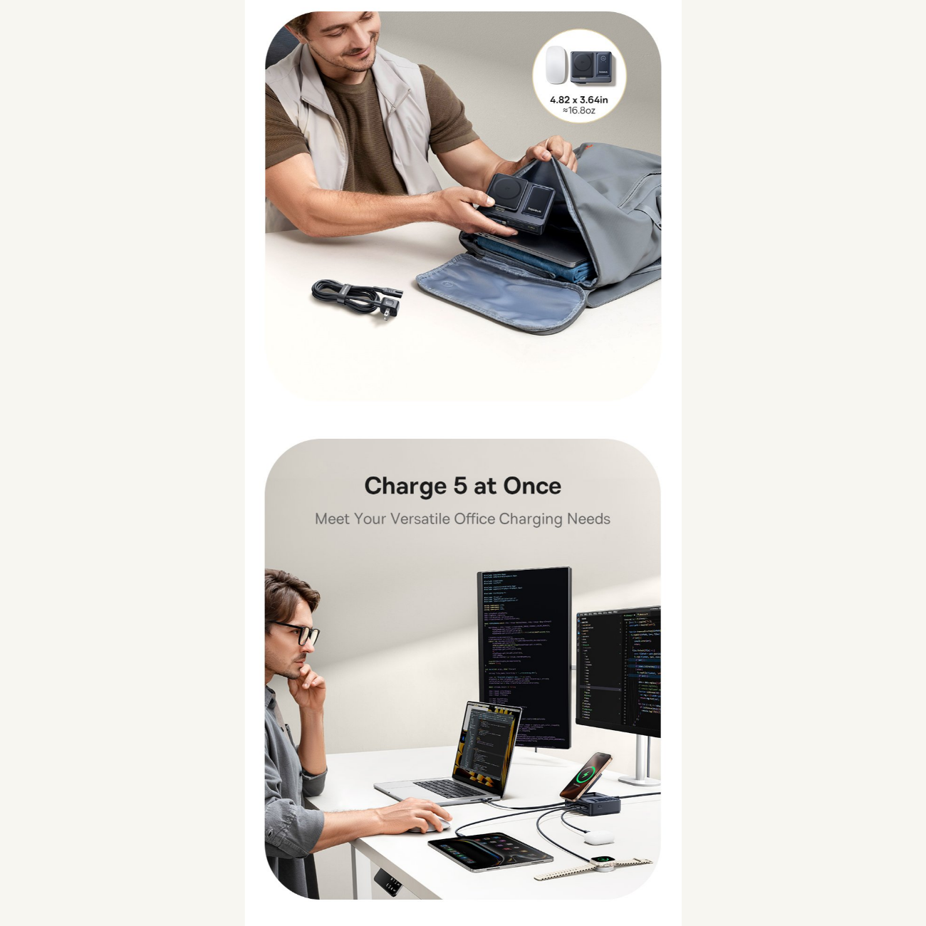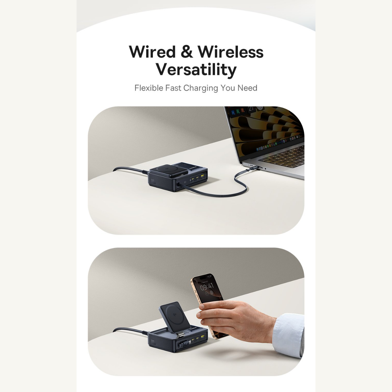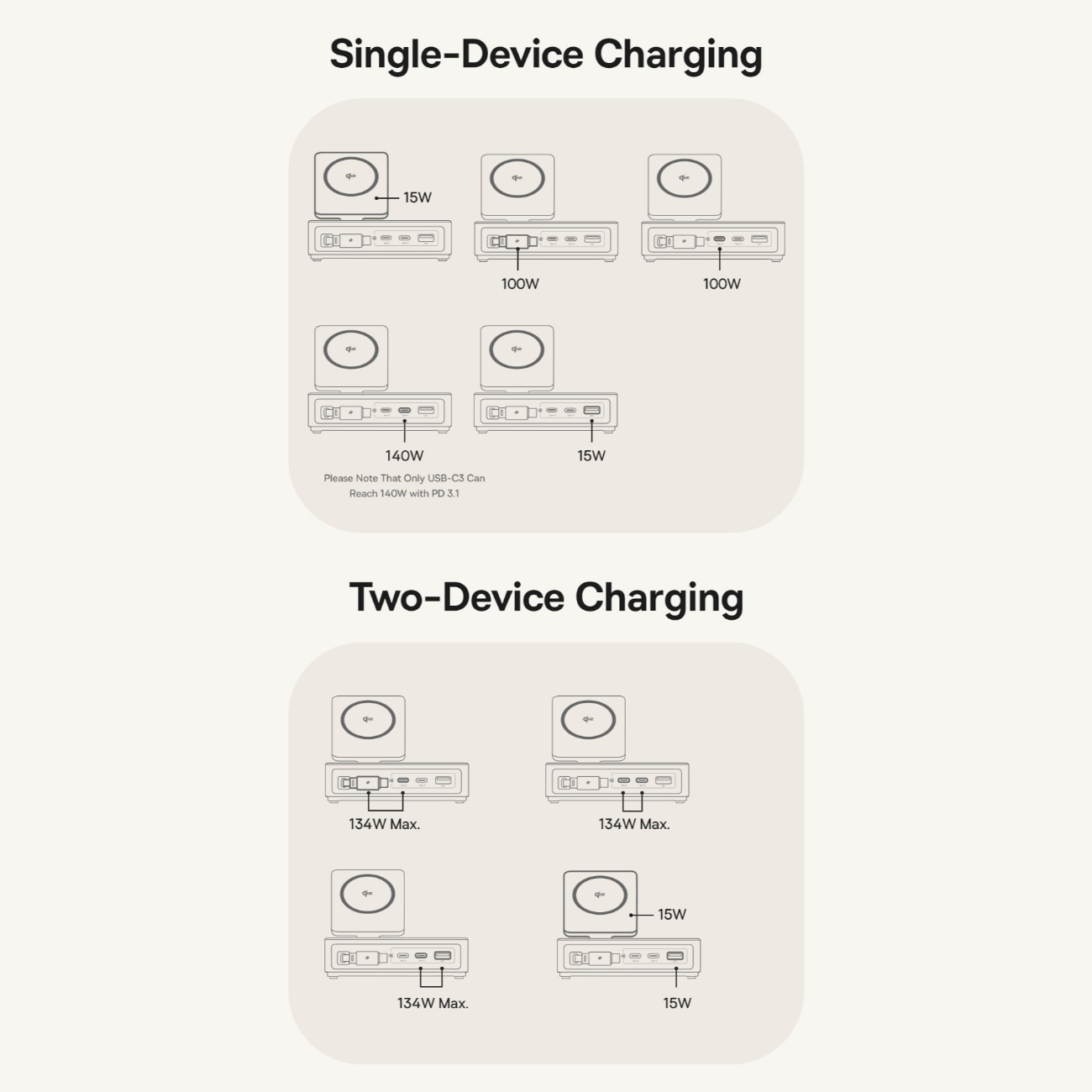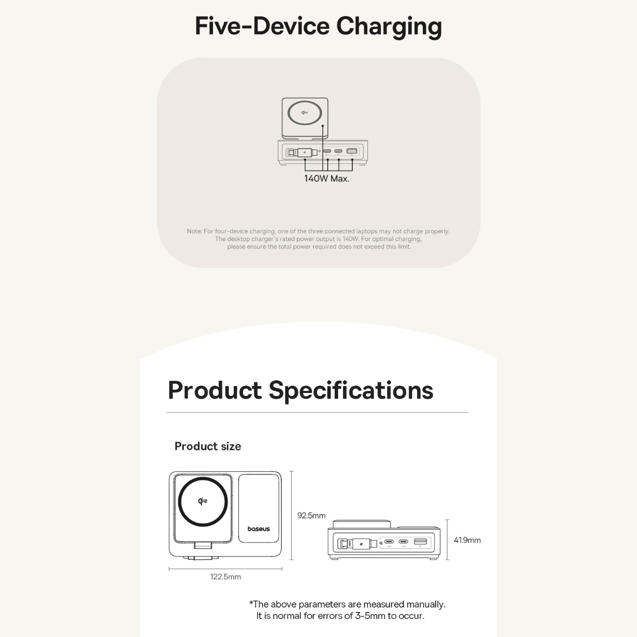 | سایر ویژگیها | توان کلی خروجی 140W با قابلیت تقسیم هوشمند بین پورتها پشتیبانی از فناوری PD 3.1, PD 3.0, QC 3.0, PPS و پروتکلهای شارژ سریع متداول شارژ وایرلس مغناطیسی استاندارد Qi2 با توان 15W برای آیفون (سری 12 تا 16، iOS 17.2+) توان وایرلس 5W برای برخی گوشیهای اندرویدی مجهز به Qi2 دارای 2 پورت USB-C با توان خروجی تکی هرکدام تا 100W مجهز به کابل USB-C جمعشونده (Retractable) با توان 100W 1 پورت USB-A با توان خروجی تا 15W نمایشگر دیجیتال LED/LCD برای نمایش توان لحظهای و وضعیت شارژ ورودی برق: AC 100-240V، 50/60Hz، 2.5A (max) کابل برق جداشونده با طول 1.5 متر جنس بدنه: پلاستیک مقاوم PC + ABS با تحمل حرارت و ضربه طراحی جمعوجور و رومیزی مناسب برای خانه، دفتر کار و سفر پایه شارژ وایرلس تاشو با قابلیت تنظیم زاویه و اتصال مغناطیسی قوی سازگار با لپتاپهای پرمصرف (MacBook Pro و سایر لپتاپهای USB-C) قابلیت شارژ همزمان چند دستگاه مختلف بدون افت سرعت محسوس تراشه هوشمند برای حفاظت در برابر اضافهولتاژ، اتصال کوتاه، افزایش دما و اضافهبار گواهی رسمی Qi2 (QI-ID 22121) برای شارژ بیسیم مطمئن تستهای ایمنی و گواهی FCC برای اطمینان از کیفیت و استاندارد جهانی طراحی مینیمال و زیبا برای مرتبسازی میز کار مناسب برای شارژ گوشی، تبلت، لپتاپ، هدفون و سایر گجتها محتوای جعبه: شارژر رومیزی، کابل برق 1.5m، دفترچه |