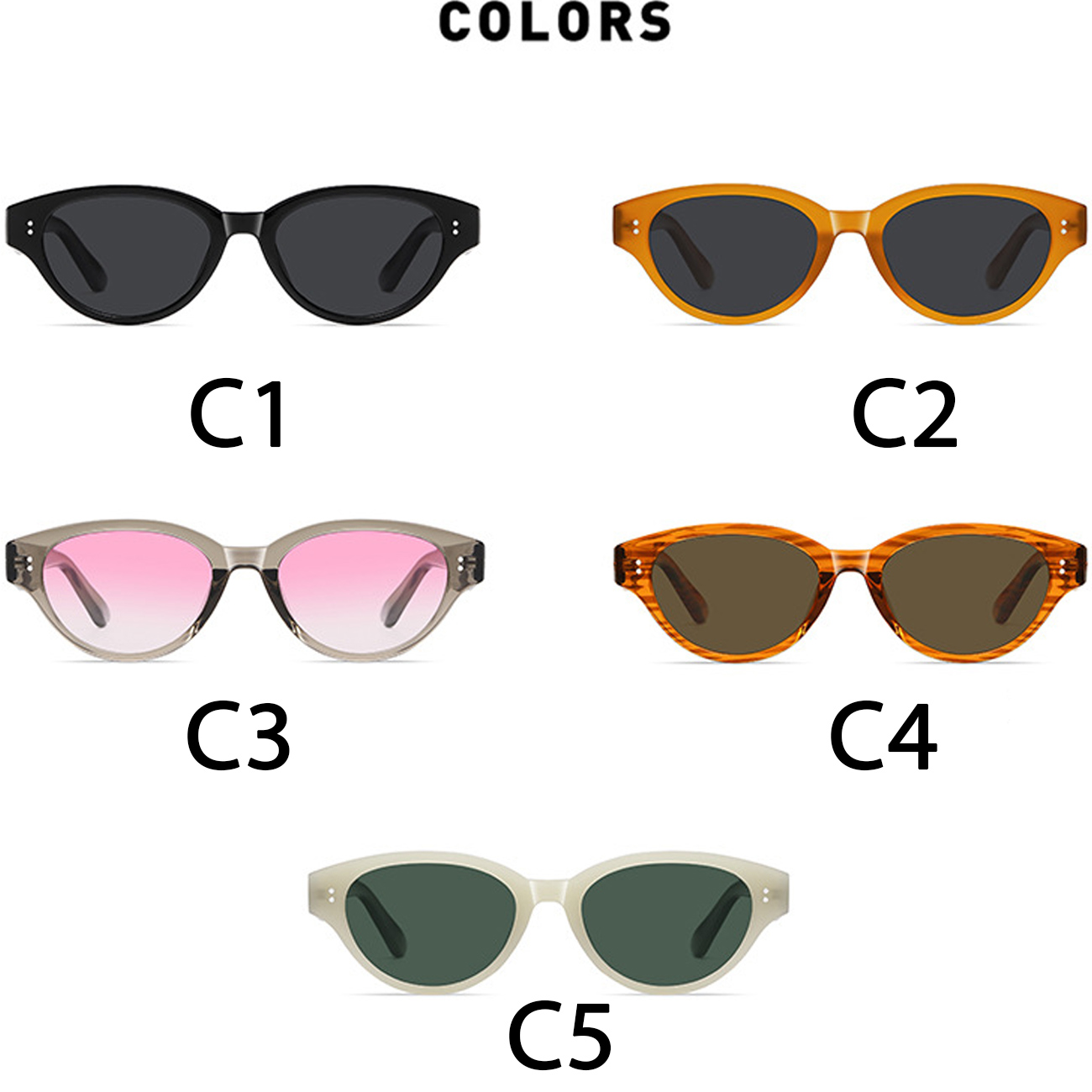 | رنگ بندی | مشکی خاکستری C1، کدویی خاکستری C2، راه راه قهوه ای C3، طوسی شفاف صورتی گرادینت C4، فریم بژ با دسته مشکی لنز G15 C5 |