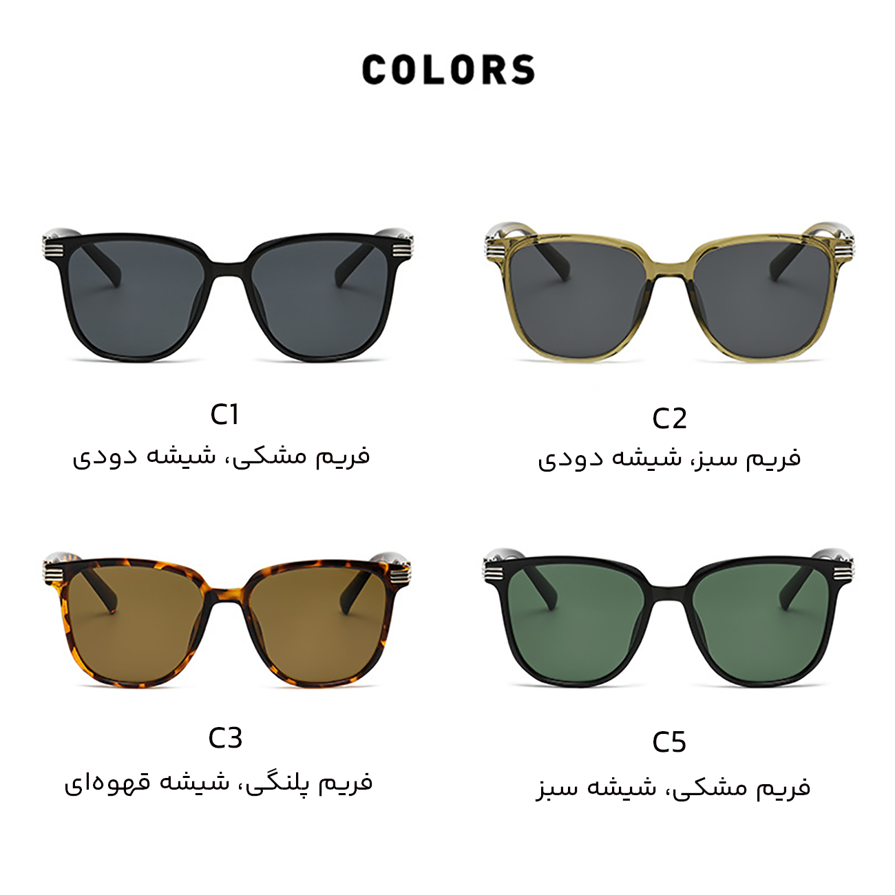 | رنگ بندی متنوع | فریم مشکی شیشه دودی C1، فریم سبز، شیشه دودی C2، فریم پلنگی، شیشه قهوه ای C3، فریم مشکی، شیشه سبز G15 C5 |