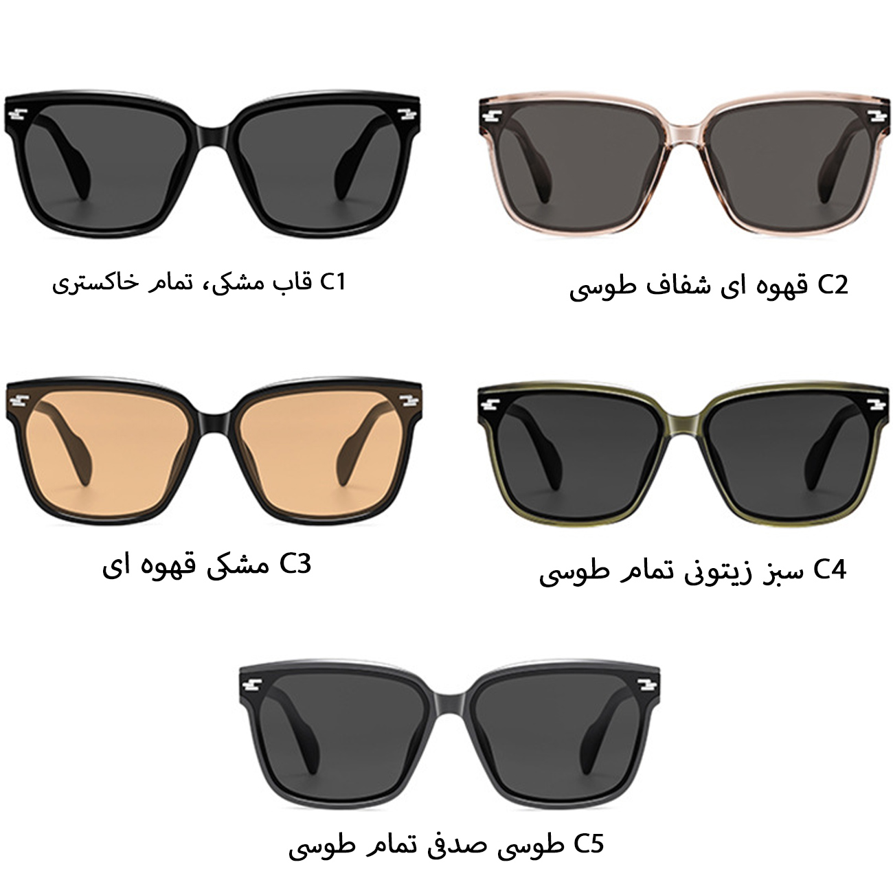 | رنگ بندی | مشکی طوسی C1، قهوه ای شفاف طوسی C2، مشکی قهوه ای C3، سبز زیتونی طوسی C4، طوسی صدفی C5 |